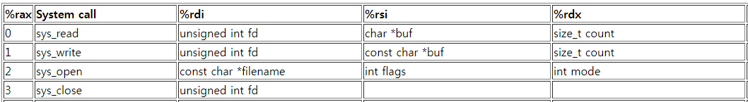 어셈블리 프로그래밍을 진행하기전에 필요한 syscall은 open, read, write이며 해당 테이블을 첨부해두겠다.
