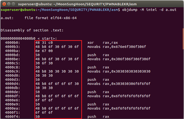 objdump를 이용하여 확인해본 결과 다음과 같은 바이트 코드들을 확인할 수 있다.