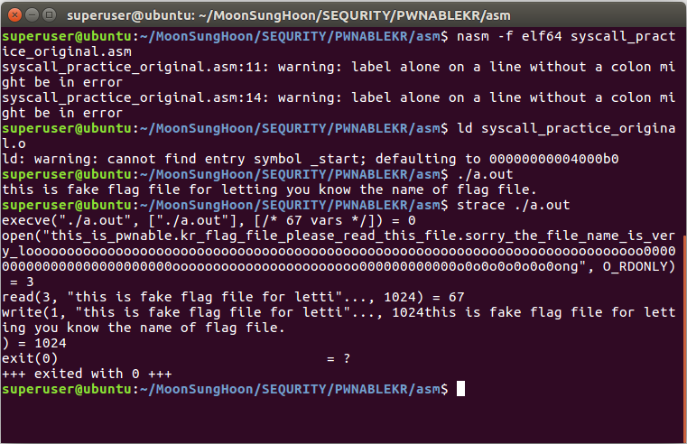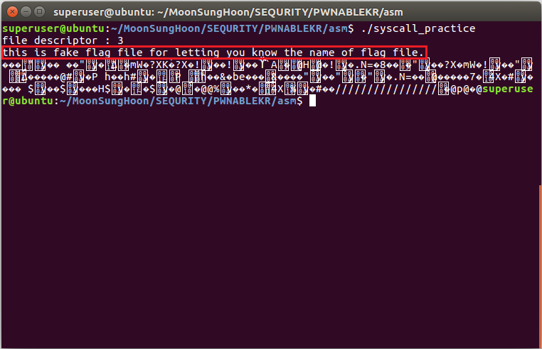 해당 소스코드를 컴파일[gcc -o syscall_practice syscall_practice.c]해서 실행시켜 본 결과