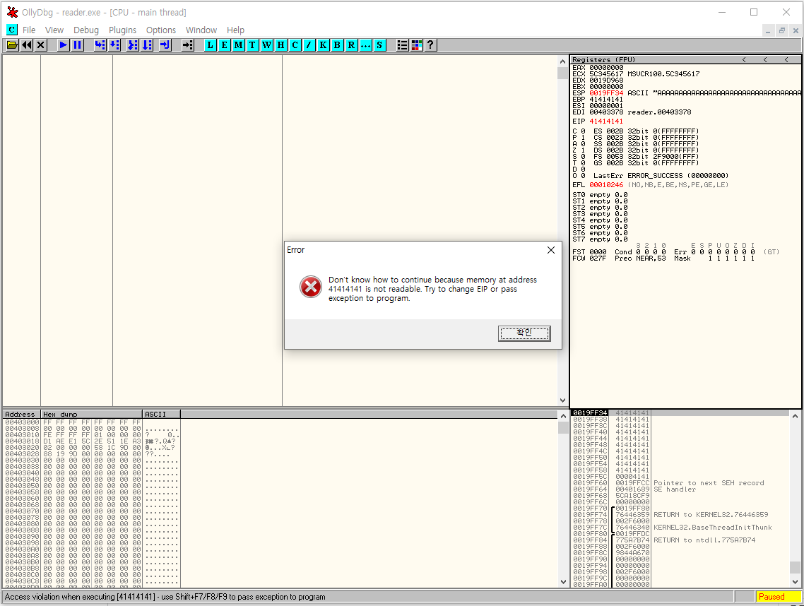다음과 같이 EIP가 0x41414141로 변조된 것을 확인할 수 있다.
