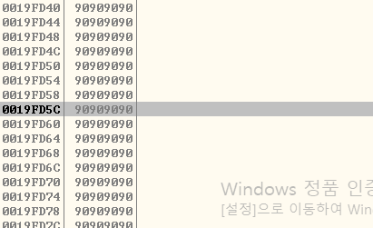 다음과 같이 스택의 Nop Sled를 로드 후 Stack의 주소 중 적당한 곳으로
