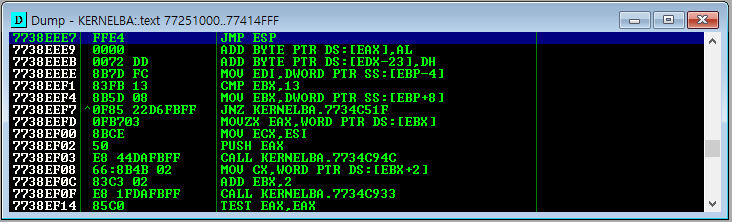 주소 0x7738EEE7에 jmp esp 역할을 하는 가젯이 있는 것으로 확인된다.