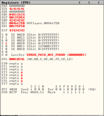 그 후 VUplayer를 이용하여 샘플파일을 실행시키는 순간 다음과 같이 EIP가 변조된 것을 확인할 수 있다.